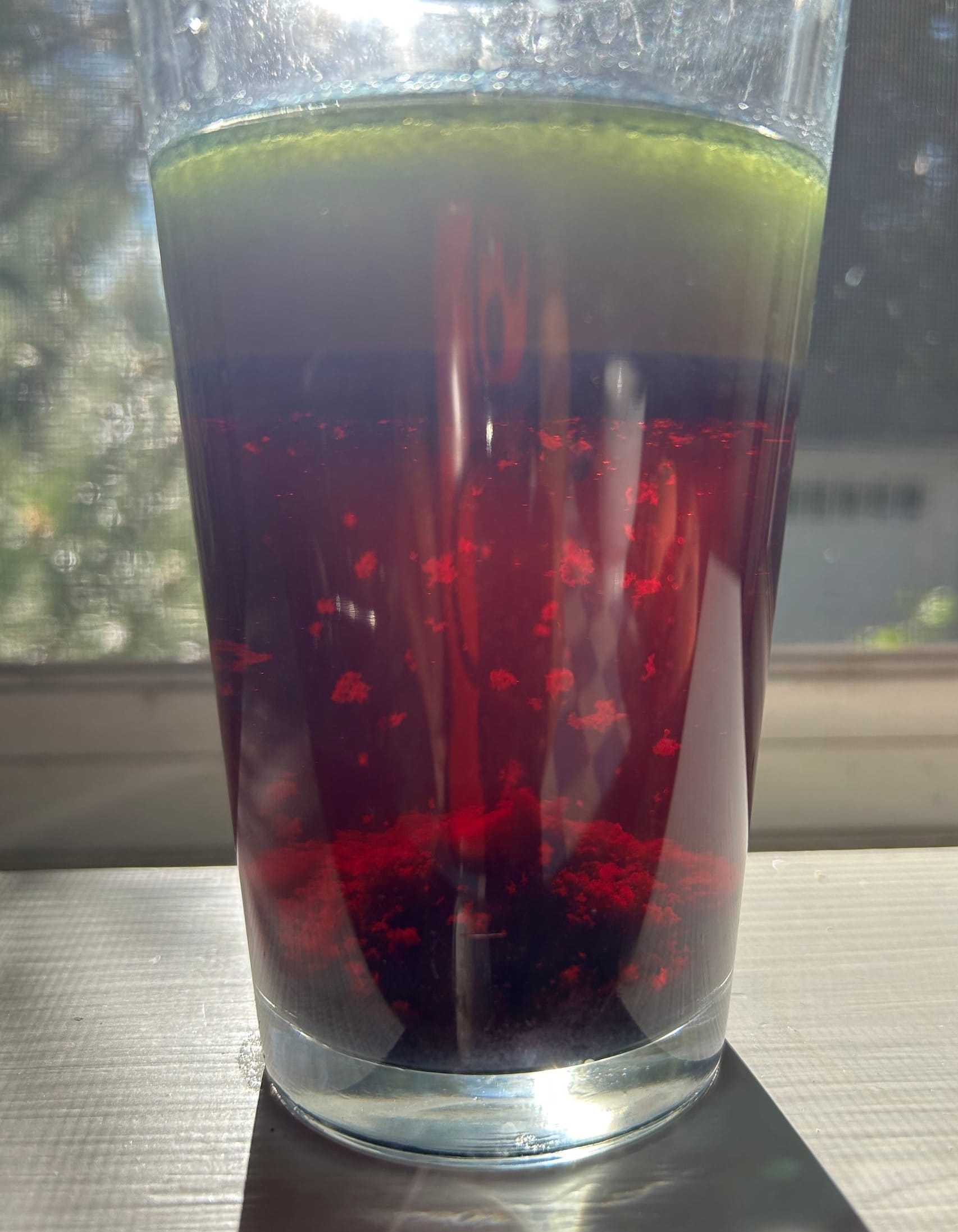 • Or, let the child run with something they observe or ask about. Let’s say that the child notices that oil and “water” (vinegar, lemon juice, etc.) don’t mix in salad dressing. Let them learn more about this by supplying a few ingredients. One grandson and I riffed on the basic observation that oil and water don’t mix with the help of a little vegetable oil, water, food coloring, and Dijon mustard. With minimal direction, I let him add a little of this and a little of that to see what happened. The messing around led to (very brief) discussions of densities and emulsions. See the photo below: Shaken up, this mix was an unappetizing coffee-like brown. But after sitting a couple days, what interesting layers—and rather pretty.